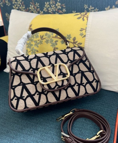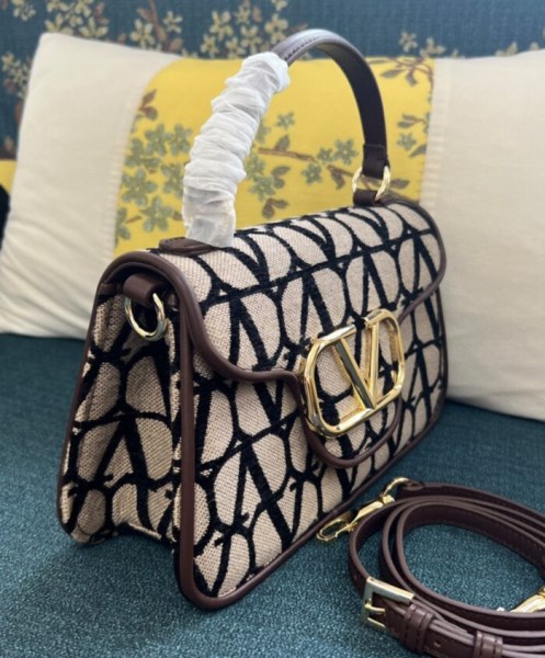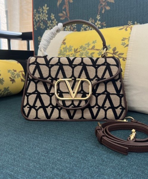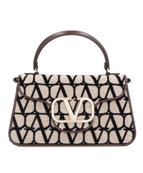Handbag by Valentino Garavani in Toile Iconographe featuring a metallic Vlogo Signature element on the front, an all-over logo, leather trim, a fixed handle, a flat leather pocket on the back, an internal flat pocket, an adjustable and removable shoulder strap and gold-tone metal hardware.